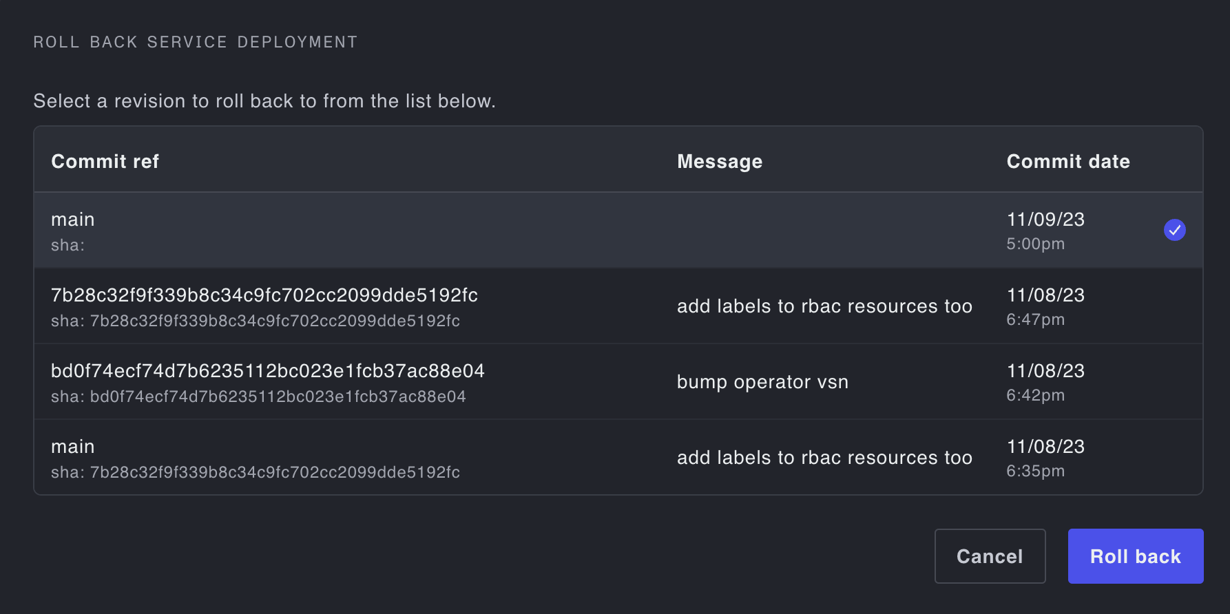 To roll a service back to a prior revision, you can either select the Rollback icon from the deployments table or the Revisions tab from the Service details page.
